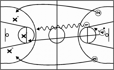 X3: Bleibt bei Angreifer , wenn dieser den Ball wegpasst. Bei Pass zu Angreifer ‚ sinkt er entsprechend ab, um wieder als Helfer bereit zu sein. Bei Pass zu Angreifer ƒ sinkt er in Richtung Korb.