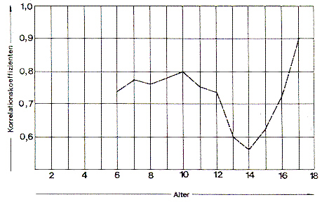 ![]() | Abb. 2: Koorelationskoeffizient zwischen juvenilen und definitiven Werten (definitives Alter 19,5 Jahre) der Körperlänge bei Jungen (SHUTTLEWORTH 1939; zitiert nach ZACIORSKIJ et al. 1974, 249) [Erläuterung: erst ab dem 17. Lebensjahr ist eine zuverlässige Vorhersage der endgültigen Körperlänge möglich! Zwischen dem 11. und dem 16. Lebensjahr ist die Prognose drastisch verschlechtert. Daher die Forderung, Spielernicht frühzeitig auf eine Position festzulegen] |